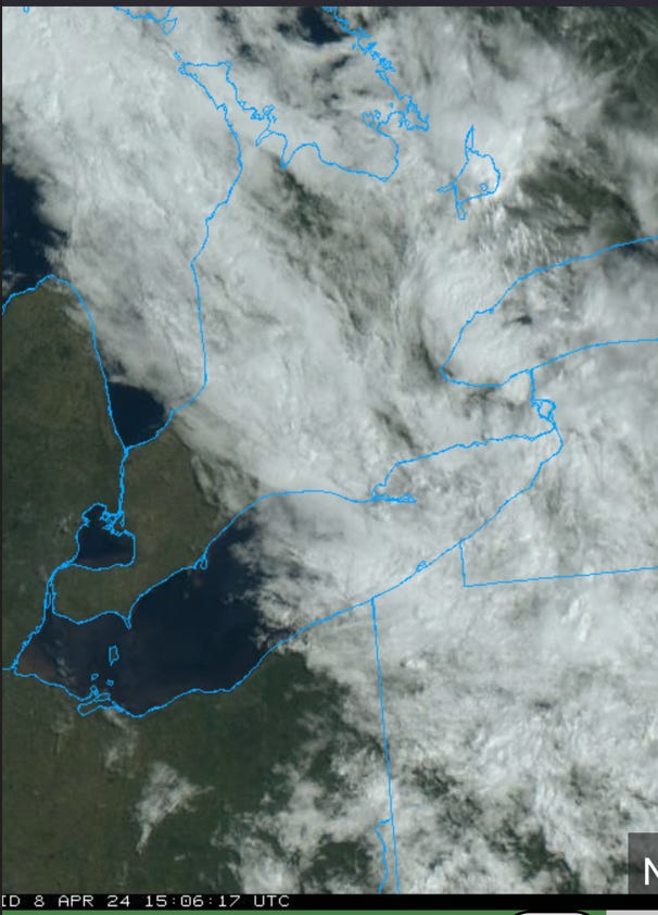 What was quite amusing, in a frustrating way, was that Southern Ontario did not have a cloud in the sky in the two days preceding — Saturday, Sunday — and the day after, the Tuesday. Only eclipse day itself, the Monday, received notable cloud cover. A trough in the US Midwest pushed thicker midlevel cloud into Southern Ontario in the early Monday morning hours that lasted until 30 minutes before totality time in some places. It came down to the last minute for clearing in some parts within the eclipse line.