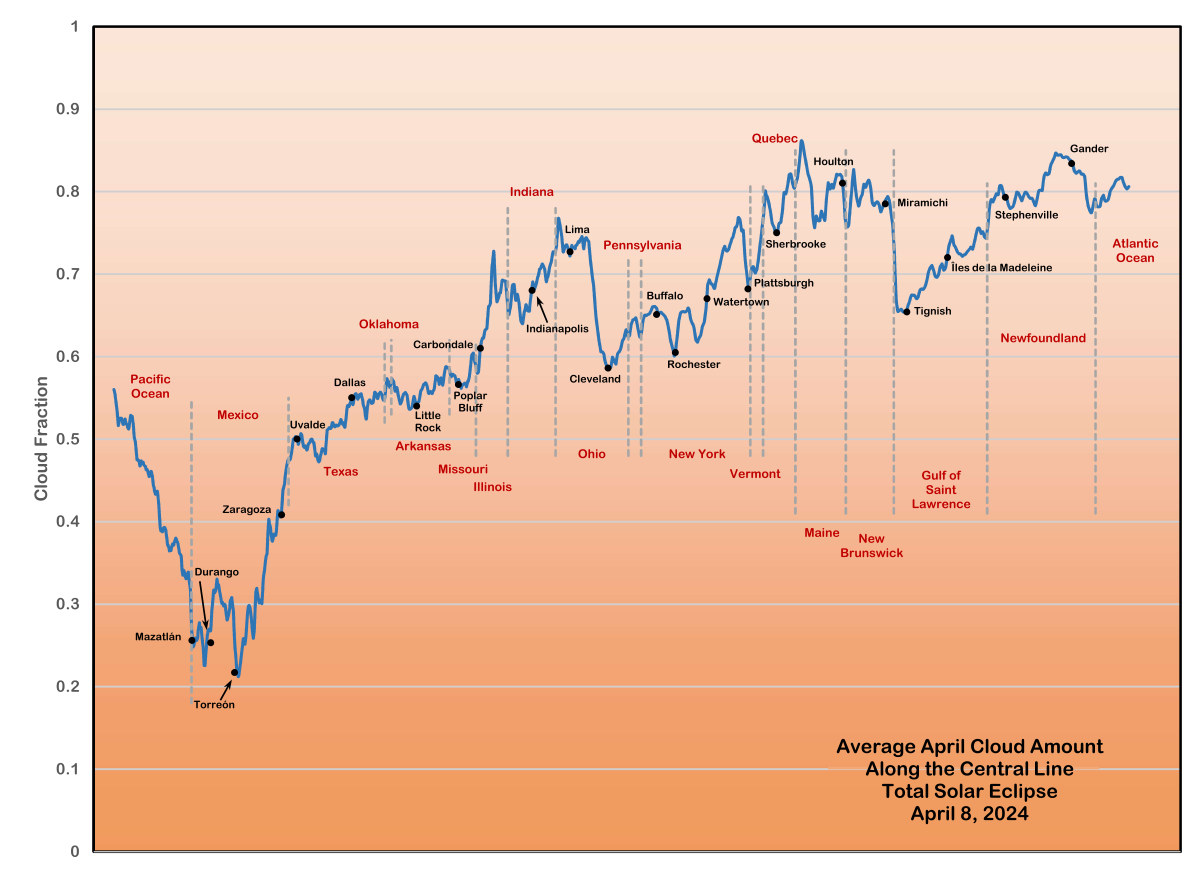 Based on the lowest chances for cloud cover by climatology, my original plans, years ago, were to head to Texas to view the eclipse. Mexico provided the best odds for low cloud viewing based on climatology, but Texas (Dallas, specifically), would be the cheapest option for best chances in my case. The totality line would pass directly over the city, so anywhere along that line, especially heading to the southwest, would provide for good viewing - at least by climatology.