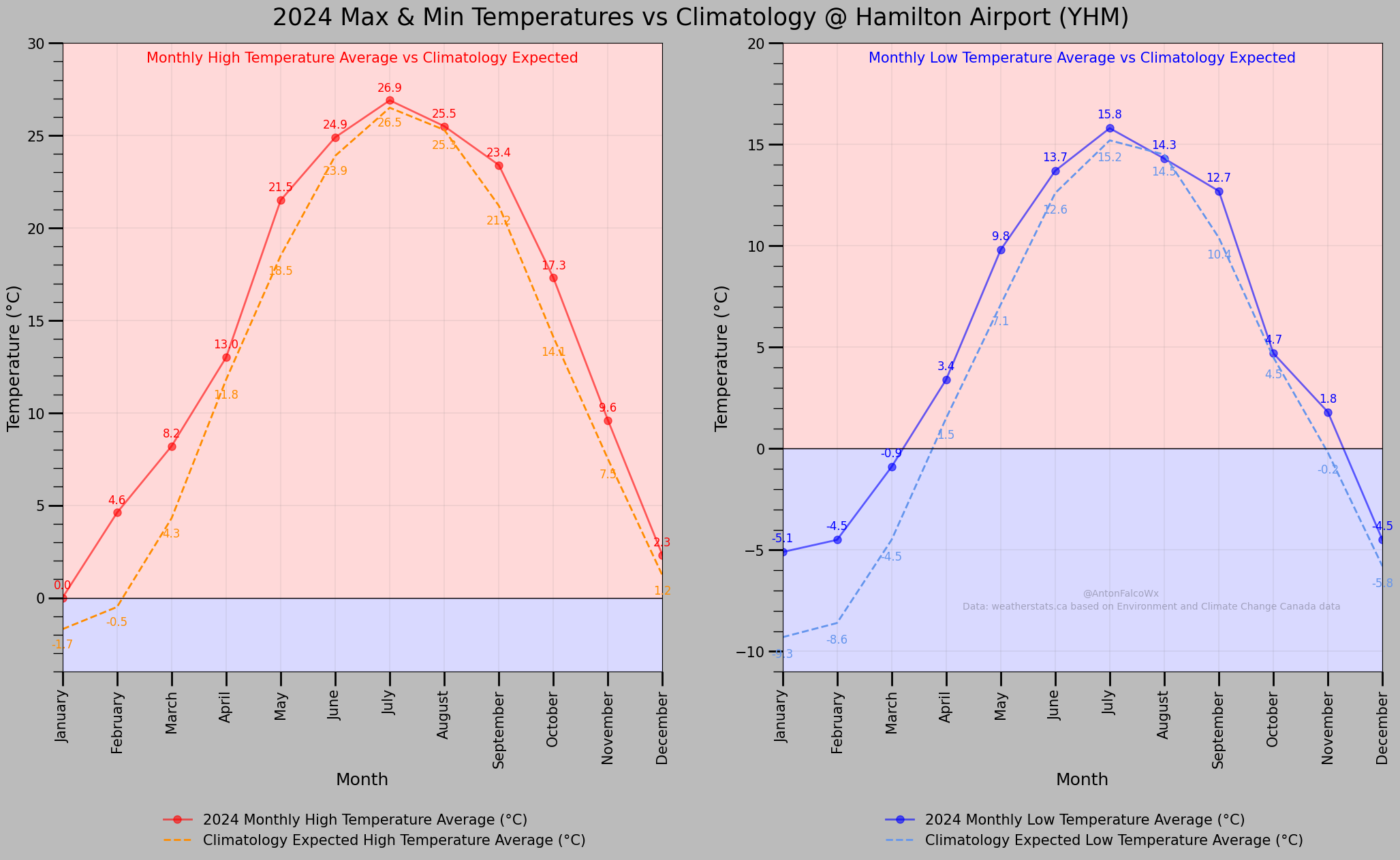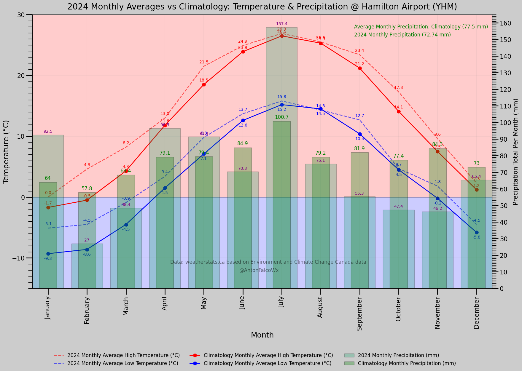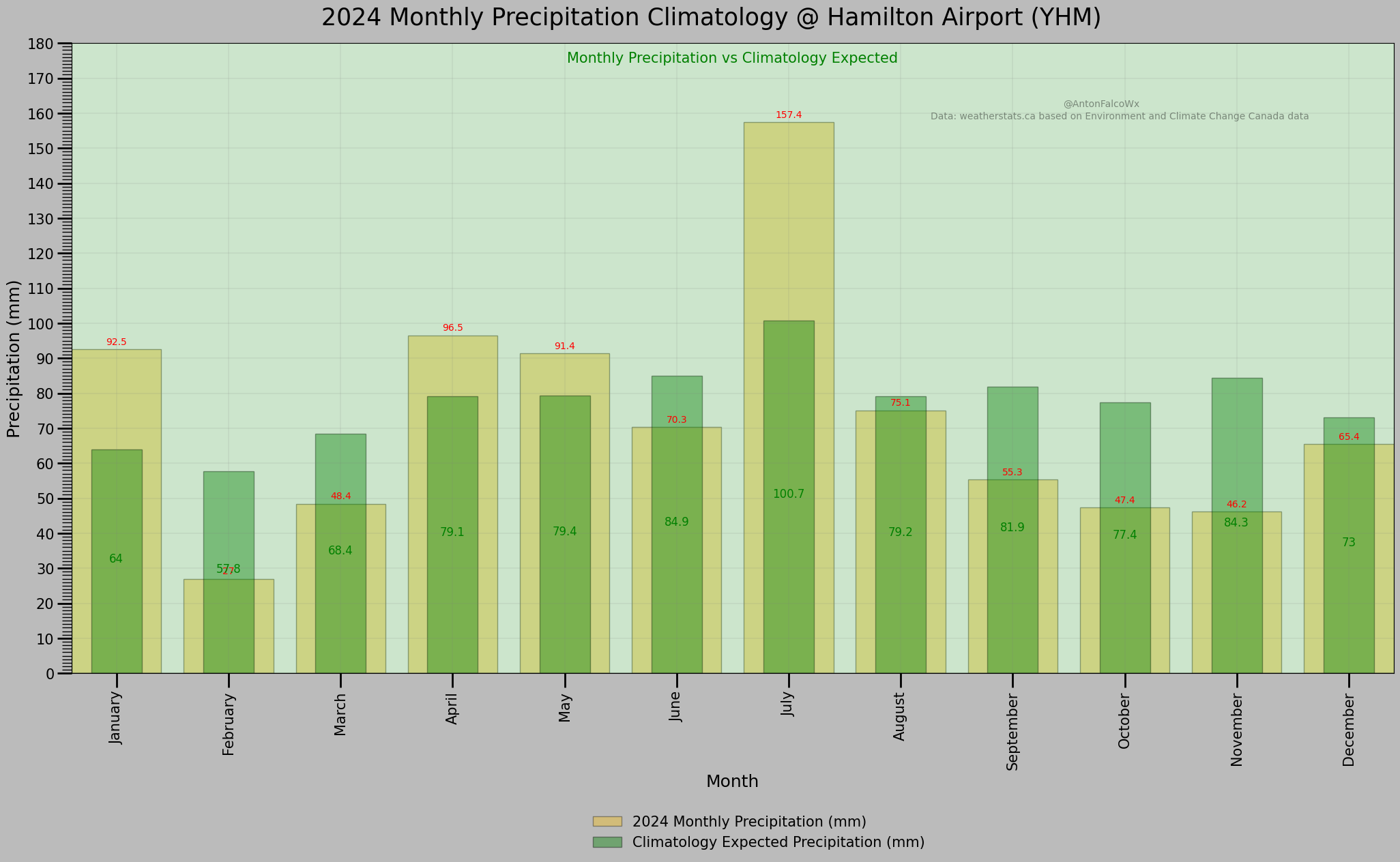 For 2024, I used the 1981-2010 YHM climate normals visualization. In short, these are the monthly average temperatures and precipitation totals you can expect to see per month at the Hamilton airport station. I started the year with the 1981 dataset and wanted to finish it out for the year, but I will be switching this to the 1991-2020 normals for 2025.